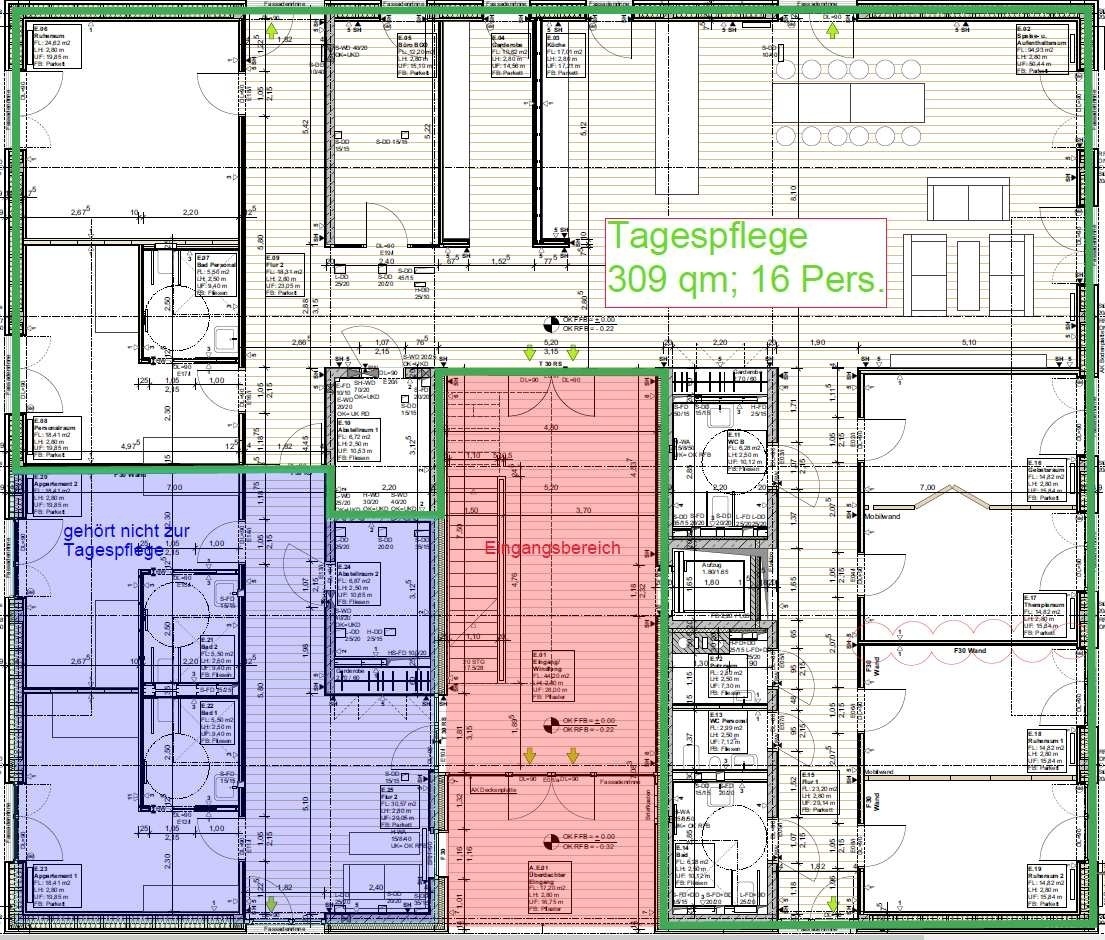 Planungen TagespflegeErdgeschoss des nördlichen Hauses mit der Tagespflege (grüne Umrandung im Grundriss). Daneben befinden sich 2 barrierefreie Ferien-Apartments (blaue Fläche im Grundriss), die nicht zur Tagespflege gehören.