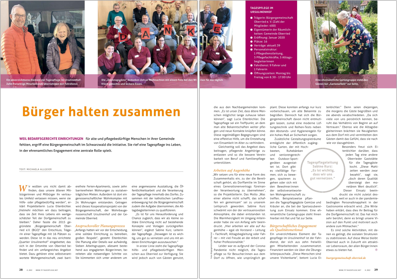 Der Ursulinenhof in Oberried ist nicht einfach nur irgendein Pflegeheim für ältere Menschen. Er ist vielmehr ein Projekt aus der Bürgerschaft und gleichzeitig eine Herzensangelegenheit vieler Helfer im Ort. Die Bürgergemeinschaft Oberried will mit dieser Einrichtung den immer älter werdenden Menschen im Land signalisieren, dass man in Würde und gleichzeitig selbstbestimmt altern kann.