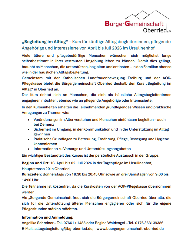 Fachliche Inputs vermitteln Grundlagenwissen, praktische Beispiele und Übungen bieten vielfältige Auseinandersetzungsmöglichkeiten. Dabei spielen die Lebens- und Arbeitserfahrungen der Teilnehmerinnen eine wichtige Rolle. Die Kurskosten liegen bei 100 Euro, wobei die Hälfte der Kosten bei einer Tätigkeit als Alltagsbegleiterin in der Bürgergemeinschaft Oberried wieder erstattet werden können.